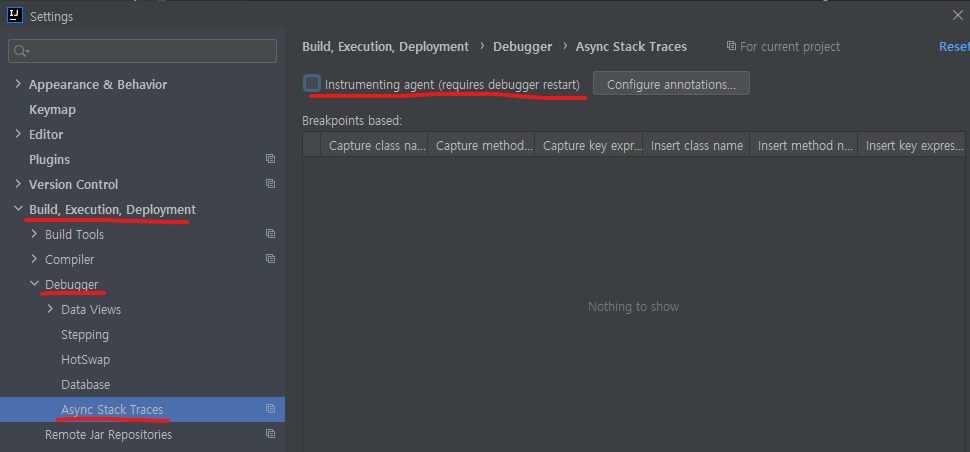 에서 Instrumenting agent 체크를 풀어주면 된다.